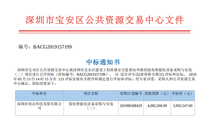 喜報:我公司中標《弱電智能化設備采購與安裝項目》