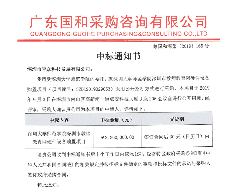 喜報:我公司中標《深圳大學師范學院教師教育網硬件設備購置項目》